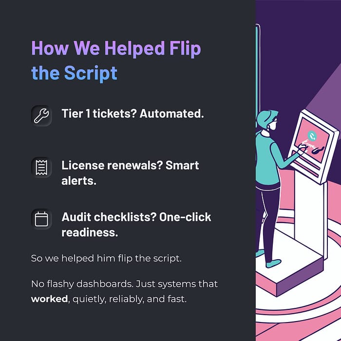 We connected his existing helpdesk system to an automation layer that handled most of these requests via AI, without the tech team ever touching them.